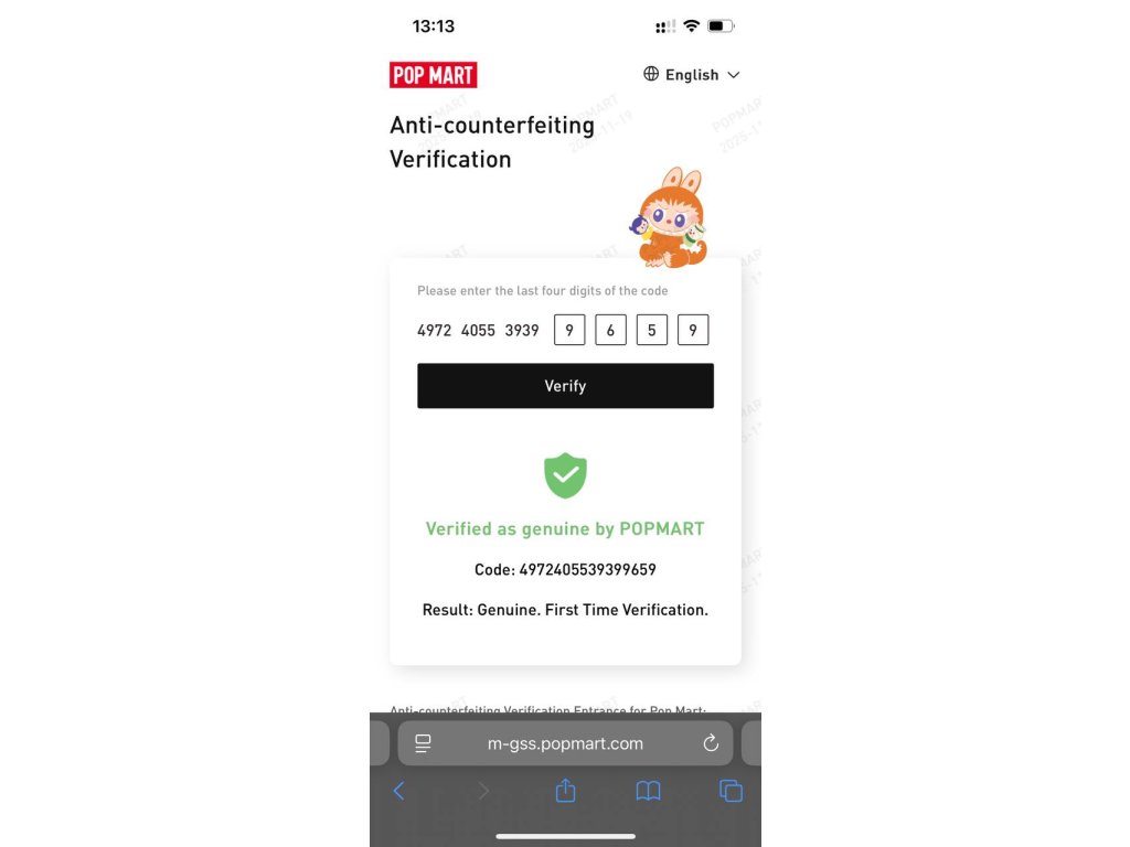 ✔ Ověření pravosti – produkt je originální Pop Mart (první úspěšná verifikace).